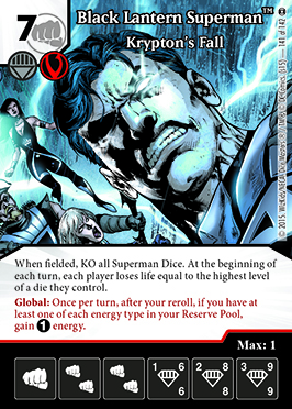 Cuando es puesto en juego Superman Linterna Negra manda al KO a todos los dados de Superman.