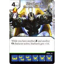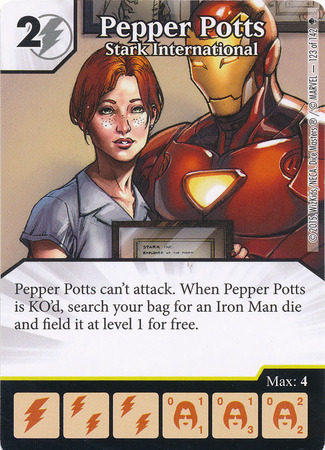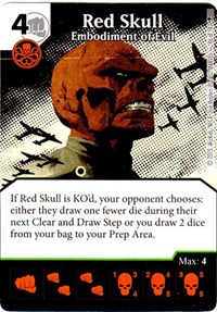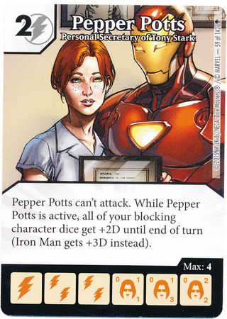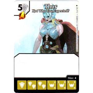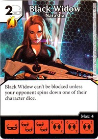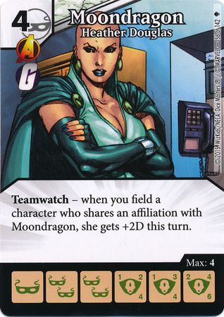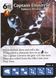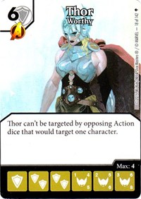 Uno de los personajes que tienen súper rara en esta colección. Personalmente no es una carta que yo jugaría en ninguno de los tres formatos. Costes altísimos de compra, y habilidades que están muy condicionadas a jugar un equipo de sólo vengadores porque si no, no salen a cuenta. No tiene un dado malo pera aun así son más cosas malas que buenas las que tiene.