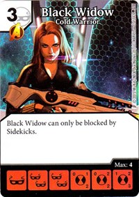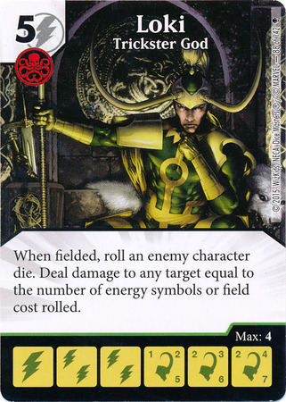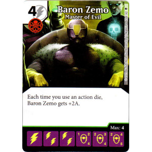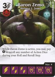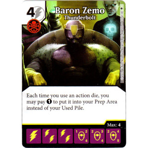 Aquí tenemos sus tres versiones, la versión rara del mismo nos podría servir si hacemos un equipo muy enfocado a usar acciones básicas. Nos permite poner los dados de acción que acabamos de usar en la prep área, con la condición de gastar una energía. No me parece para nada excesivo y puede ser un buen plan si queremos hacer un equipo bien equilibrado, que llegado el momento nos permita fildear a Baron Zemo y, por ejemplo, poder estar tirando bolts una y otra vez hasta acabar con nuestro oponente. Tiene coste de compra 4, lo cual no es descabellado, podría ver la mesa pronto y a partir de ahí empezar a jugar acciones. Tampoco tiene mal dado, aguanta los ataques de Hulk, que tanto nos preocupan, en sus tres caras del dado, aunque, por poner una pega, los costes de fildeo son un poco altos. Es un personaje que podría llevarse muy bien con el Ángel raro de Avengers (imbloqueable cada vez que juegas una acción básica). En cuanto a bloque es un personaje al que le veo potencial, ya que no es demasiado disparatado en cuanto a precio de compra y el dado es bueno, con la acción básica Nasty Plot se lleva bastante bien, y nos permite una opción buena en cuanto a rampeo. En cuanto al juego limitado no lo veo potencialmente tan bueno como otros personajes, lo único los costes no demasiado desorbitados de compra y un dado bueno.