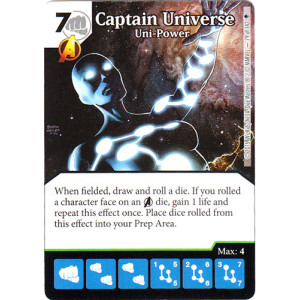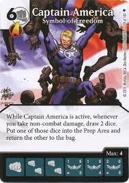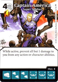 Capitán América: otro de los personajes del starter y otra de las reediciones con cambios en cuanto a energías. El único que podría ver algo de juego es el que reduce a 1 el daño hecho por un personaje. Puede servirnos contra Gobby o Tsarinas, reduciendo considerablemente el daño que pueden hacernos. Además es el de coste 4, asequible y buen dado. Lo podremos jugar en construido y en bloque, ya que en limitado sólo tenemos la opción que no aparece en el starter, y esa es demasiado cara y la habilidad no es tan buena.