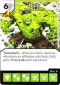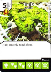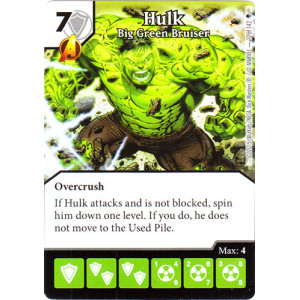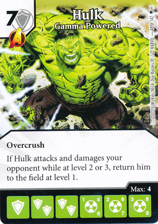 Otro de los personajes que aparece en el starter es Hulk. Qué decir conociendo a Hulk (Green Goliath). No se acerca a lo que conocemos y hemos visto jugar en muchos de los equipos de construido. Creo que exitiendo otro Hulk que tiene una habilidad mucho mejor (hacer 2-3 daños a toda la mesa del oponente y con habilidades/globales que nos permiten activarlo fácil) este no entraría en nigún equipo de construido (tenemos que tener en cuenta que no se pueden tener dos personajes en un mismo equipo que se llamen igual, aunque sean de colecciones distintas). Podría ser curioso en un limitado para rellenar un hueco, ya que la opción que sale en los sobres (el que si ataca en nivel 2 o 3 vuelve en nivel 1 si hace daño AL OPONENTE) puede estar curioso para atacar y que vuelva, además de tener buen dado. La pega es el coste 7 de compra, habría que mirar el resto de nuestro euipo para ver si entra, asique, está muy condicionado. En bloque o un equipo de afiliaciones no lo acabo de ver tampoco, para Vengadores tenemos a Green Goliath que nos hace mejor apaño y además podríamos darle overcrush con Hulk out (acción básica) en caso de ser necesario.