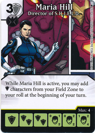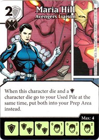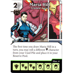 Maria Hill tiene interacciones con los personajes de escudo. Vamos a ver un poco las posibilidades que nos ofrece. En cuanto a limitado la jugaría porque es un coste 2 (3 sería la rara, más difícil que nos salga) con un buen dado, si tienes personajes de escudo para acompañarla, como Hulk, Groot, Captain Marvel, etc. Pues mejor que mejor, pero aun sin tenerlos es una buena opción. En cuanto a bloque y construido jugaría más a poder sacar partido de la habilidad. La que más me gusta es la versíon infrecuente, siempre que la robes puedes rolear un personaje de escudo y ponerlo en la Reserve Pool, eso nos permite rolear de nuevo personajes que hacen habilidades al fildear o incluso buscar energías si las necesitamos en un momento determinado. La versión común también puede estar divertida, pero más condicionada a jugar escudos que la anterior, ya que necesitas muchos personajes de escudo para que ambos dados vayan a la prep (tienen que salir A LA VEZ).