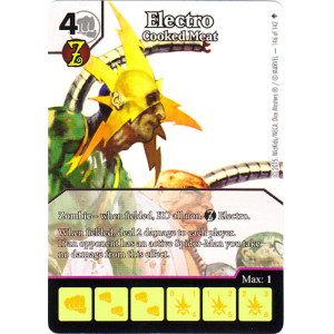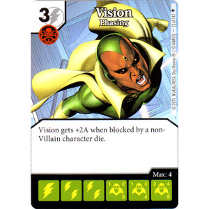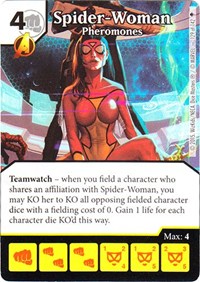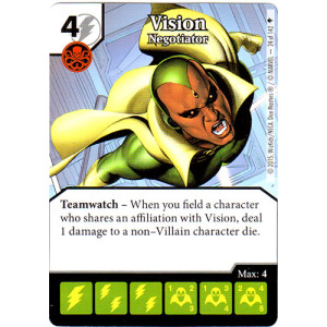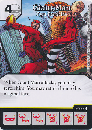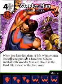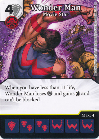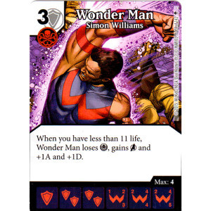 El último personaje de esta colección. Es otro de los que tienen una condición específica para que su habilidad tenga lugar, en este caso, tener menos de 11 vidas. Siempre que esto se cumple Wonder Man pasa de ser villano a Avenger. Me parece un personaje curioso para jugar en un limitado, tiene buen dado y unos costes de compra buenos. La versión infrecuente me gusta ya que cuando hace KO a un personaje lo manda a la used en vez de a la prep. Pero a parte de eso no le veo mucha más ultilidad en un equipo de construido, quizás en bloque, pero no me acaba de convencer más allá del limitado.