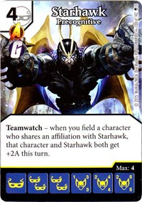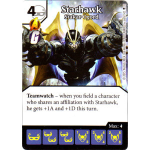En cuanto a Starhawk, ya hablamos de él en el artículo de Teamwatch en el draft. Es un personaje muy bueno en limitado, sobre todo las versiones con Teamwatch (común y rara), ya que al tener dos afiliaciones es bastante fácil combinarlo bien y que encaje en el equipo. En cuanto al juego en construido, al igual q Star- Lord, como mucho en algún equipo de afiliaciones, pero no lo veo para que se juegue en mucho más. En bloque también sería un buen personaje, ya que esta colección tiene buenos acompañantes tanto de Avengers como de Guardianes de la Galaxia.