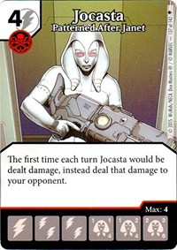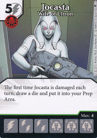 Otro de los personajes que tienen súper rara y esposa de Ultrón. Personalmente la versión súper rara me gusta bastante para jugarla en cualquiera de los formatos. Es un coste 4 de compra, lo cual es bastante asequible y tiene una habilidad muy buena. Tiene un buen dado, con buenas resistencias frente a determinadas globales/habilidades. Además la podemos usar para bloqueos a personajes grandes y la primera vez que reciba daño, lo redirigirá al oponente, que se pensará dos veces si atacar o no. En limitado me gustán las 3 versiones, no son costes desorbitados y las habilidades son buenas, obviamente es muy complicado que dispongamos de la súper rara, pero la infrecuente nos permitirá poner un dado en la prep, lo que siempre está bien. En cuanto a bloque creo que es un personaje que entra algún equipo de tipo villanos o combinada casi con cualquier cosa (versión súper rara). ¿Os imaginaís lo que podría suponer una Jocasta bloqueando a un personaje con números altos en el dado? Os animo que lo probéis!!!!.