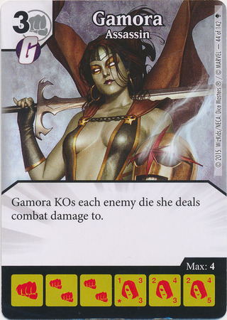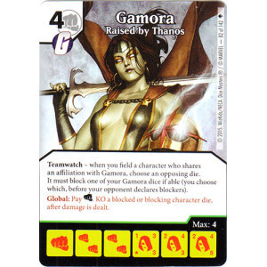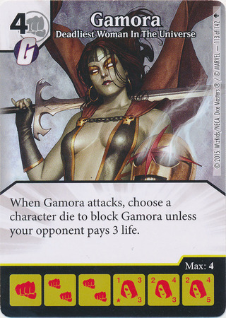 Gamora es un personaje que me gusta para jugar en bloque y limitado. Si tenemos opción de coger la infrecuente en un limitado es bastante buena. Nos permite hacer un equipo de teamwatch (ver artículo de drafteando ultrón: arquetipo teamwatch) y además tiene una global, lo que se lleva muy bien con Wasp infrecuente. En cuanto a bloque es un personaje de costes más bien asequibles y con habilidades que no están nada mal. La versión común nos permite bloquear personajes grandes y que vayan al KO, la infrecuente también nos quita un bloqueadror pagando puño, pero sea el que sea, y la rara, es un poco lo mismo, a excepción de que el oponente puede pagar 3 vidas para evitar que un personaje la bolquee. En construido creo que hay personaje scomo Spiderman (pagando puño lo bloquean todos a él) que le hacen bastante sombra a este personaje.