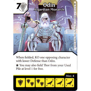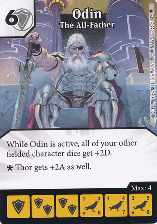 OdÍn es un personaje que no me gusta en niguno de los tres formatos. Costes demasiado altos y habilidades que no son nignuna maravilla. Tiene alguna interacción con Thor, que es un personaje que tampoco se juega, lo cual no soluciona mucho el asunto. Creo que hay muchos personajes uq están por encima de Odin en cuestión de juego.