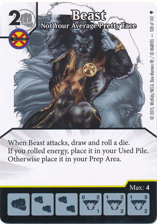 Nueva versión de Beast. A mí personalmente me parece que habiendo otra versión que se juega (Beast de Avengers) esta no verá mucho el juego en construido, en limitado nos puede resultar buena carta (sobre todo la infrecuente que nos va dando vidas) pero no la veo en cuanto al juego construido. Me sigue convenciendo mucho más la versión que ya hay, que da mucho más juego porque siempre haces cosas bastantes buenas al bloquear. A parte de que el dado del Beast de Avengers es bastante mejor. En cuanto a bloque puede ser un buen personaje de coste bajo (que siempre son necesarios) y con un dado curioso, mi preferida para esto sigue siendo la versión infrecuente, igual que en limitado. Ganar vidas es muy importante.