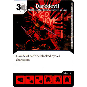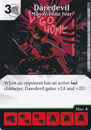 Daredevil no es del todo malo. Tenemos un personaje que está un poco condicionado a que el oponente juegue personajes con gafas como tipo de energía. En limitado por ejemplo, podría servirnos para un equipo agresivo, los costes de compra y de fildeo del dado son bajos y no tiene malos números. Y además si el oponente tiene en su equipo algún personaje con gafa, cosa que suele pasar en limitado, le podemos sacar más partido. Respecto a bloque, en la colección hay 11 personajes que tienen gafa como energía, algunos de ellos jugables en este formato, por lo que podría ser una buena opción de remouval (versión rara) o de personaje que se hace más fuerte (versión infrecuente). La versión común no me convence por el hecho de que se juegan más personajes y estaría mucho más condicionada a que sólo nos encontremos personajes de gafa para hacerlo “imbloqueable” que es lo que nos interesa. En cuanto al juego en construido no lo acabo de ver, ya que, como he dicho antes, está demasiado condicionado a las gafas. Sería bueno contra equipos que lleven por ejemplo bestias, Green Lantern y personajes así, pero yo no metería una carta “por lo que te puedas encontrar delante”, las metería por las sinergias con el resto del equipo.