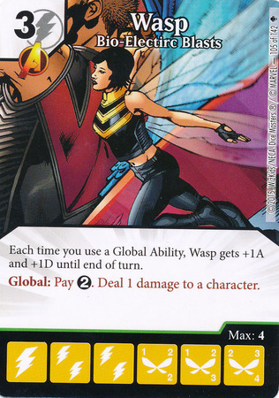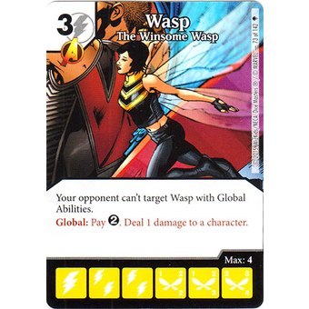 Aquí está. Para mi, sin lugar a dudas, la joya de la corona de la colección. Me parece un personaje brutal, con habilidades muy buenas y que se puede jugar en cualquier formato. Tanto la versión infrecuente (aunque esté erratada y sólo sea una vez por cada global) como la versión rara me parecen buenísimas. A parte de que ella de por si tiene una global buena que puede activar un Hulk en un momento dado, o quitar algún bloqueador de delante, se lleva muy bien con cualquier otro personaje que las tenga. Podemos jugar 2 o 3 globales diferentes en un turno sin que sea muy complicado, nuestra Wasp crecerá (versión infrecuente) o hará daños en su versión rara, si es nuestro oponente el que las usa. Dado con coste de compra muy asequible y con fildeos no demasiado malos, tiene buenos números, que más se puede pedir. Tanto en afiliaciones, como en bloque o limitado, me parece una buena carta.