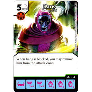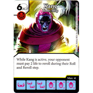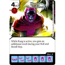Kang ha sido un personaje un poco conflictivo, ya que su versión común hace lo mismo que una súper rara de Uncanny (Scarlet Witch- Control of Probability), y no es una habilidad nada mala. Bueno esto nos da un margen mayor a la hora de hacer equipos baratos si no disponemos de las súper raras (más difíciles de conseguir). Las versiones común y rara me gustán mucho, la rara en un equipo de villanos iría de perlas, ya que rara es la vez que no quieres hacer rerroll de alguno de los dados, con Kang en mesa habrá alguno que se lo piense dos veces y si lo necesitas ¡dos vidas!. Y la común pues nos da mucha ventaja a la hora de buscar lo que queremos en los dados, ya que tenemos una tercera tirada si las dos anteriores no nos han gustado. Creo que es un personaje muy bueno para jugar en cualquier formato. Además tiene un buen dado y la versión común un coste de compra muy bueno.