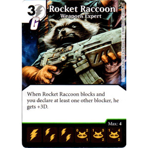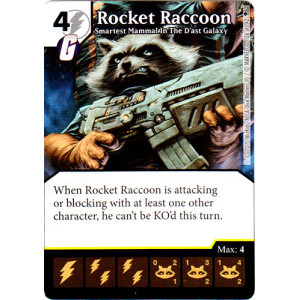 Brutal este personaje en un equipo de limitado, coste bajo, buenos números y todo en su versión común. Cuando Rocket ataque acompañado de otro personaje gana +2A, lo cual nos da bastante ventaja, ya que puede estar en mesa bastante pronto y sólo tienes que tener un sidekick para que ataque con él. Encaja tambíen bien en un equipo de Guardianes de la Galaxia, junto con Groot, Starhawk, Gamora…. Tiene varias posibilidades tanto en limitado como en cosntruido. Sus versiones infrecuente y rara no las jugaría, le veo mucho más potencial a la común, lo que está muy bien, porque es más fácil que todo el mundo tenga su copia!.