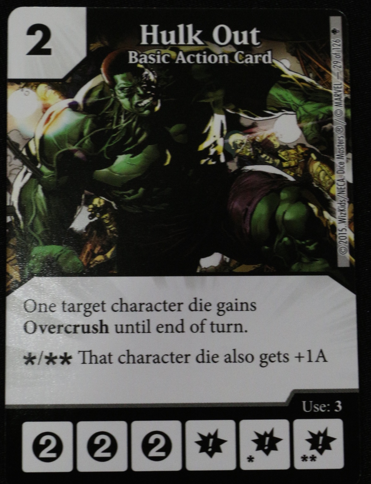 Gran carta para jugar en limitado, sobre todo en su versión infrecuente. Como ya hemos dicho, en esta colección hay costes de fildeo altos, lo que nos permite ir arañando daños poco c poco. Combinada con la acción báscia Hulk Out es todavía mejor, porque supongo que como todos sabéis ya, el daño con overcrush pasaría al capturar un personaje!!!. Además su global ayuda a que lo bloqueen, lo cual es bueno, puedes elegir el dado con coste de fildeo alto para así ir arañando más daños. Como acabo de comentar, hace buenas migas con Ultrón, ya que serían tres daños adicionales. Fuera del limitado no lo acabo de ver, en un equipo de Villanos no me cuadra, ya que los hay mejores, como la Black Manta por ejemplo y en bloque igual podría salir algo curioso junto con Ultrón, Jocasta y algún personaje más que lo acompañe.