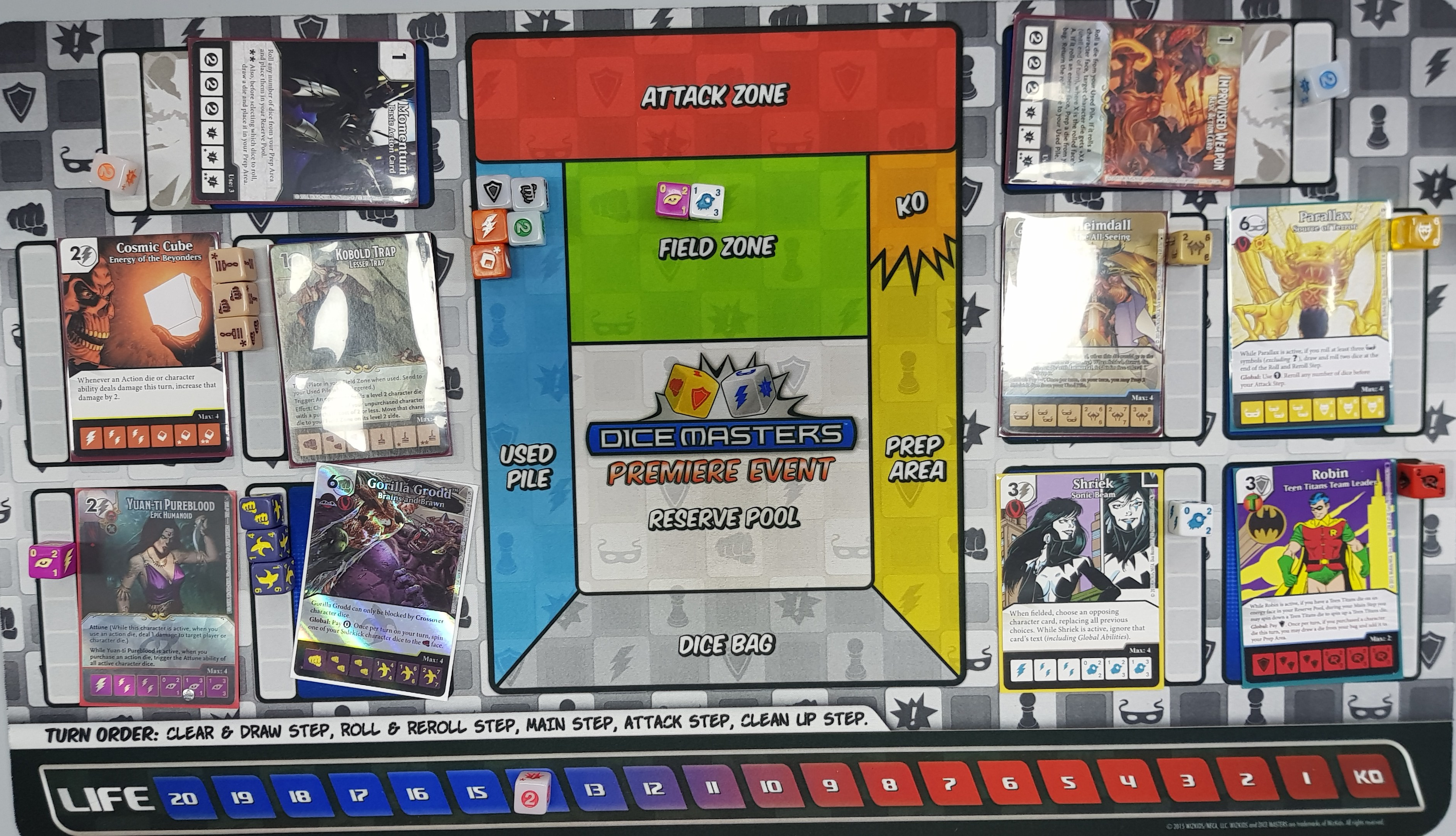 Mis miedos, hechos realidad. Primer enfrentamiento y un equipo de Yuan-Ti con un gran piloto al frente. Dado la cantidad de personajes de control que tenía en mi equipo, en la primera partida fui capaz de controlar el combo de Yuan-Ti, pero un inesperado invitado hizo acto de presencia. Con todas mis piezas de control destinadas a parar a YT, Pablo rotó hacia el daño de combate con un Gorilla Grodd, imbloqueable contra mi, que me partió la cara de mala manera. A destacar el golpe final en el que, tras comprar otro Grodd, Pablo usó Improvised Weapon para darle un +6A al Grodd 7/7 que ya tenía en el field. GG.